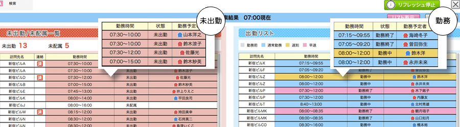 スタッフが許容範囲にシフト通りに来たかどうかをGPSで判定し、本社にてリアルタイムで勤務状況を確認できるモニター管理をしております。