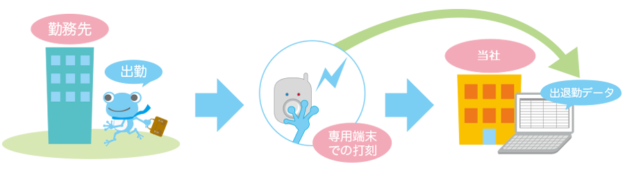 一人ひとりのスタッフに専用の小型端末を持って打刻してもらう方式を採用し、インターネットを通じて、データ化されますので入力の必要もなく専用管理画面で管理しています。